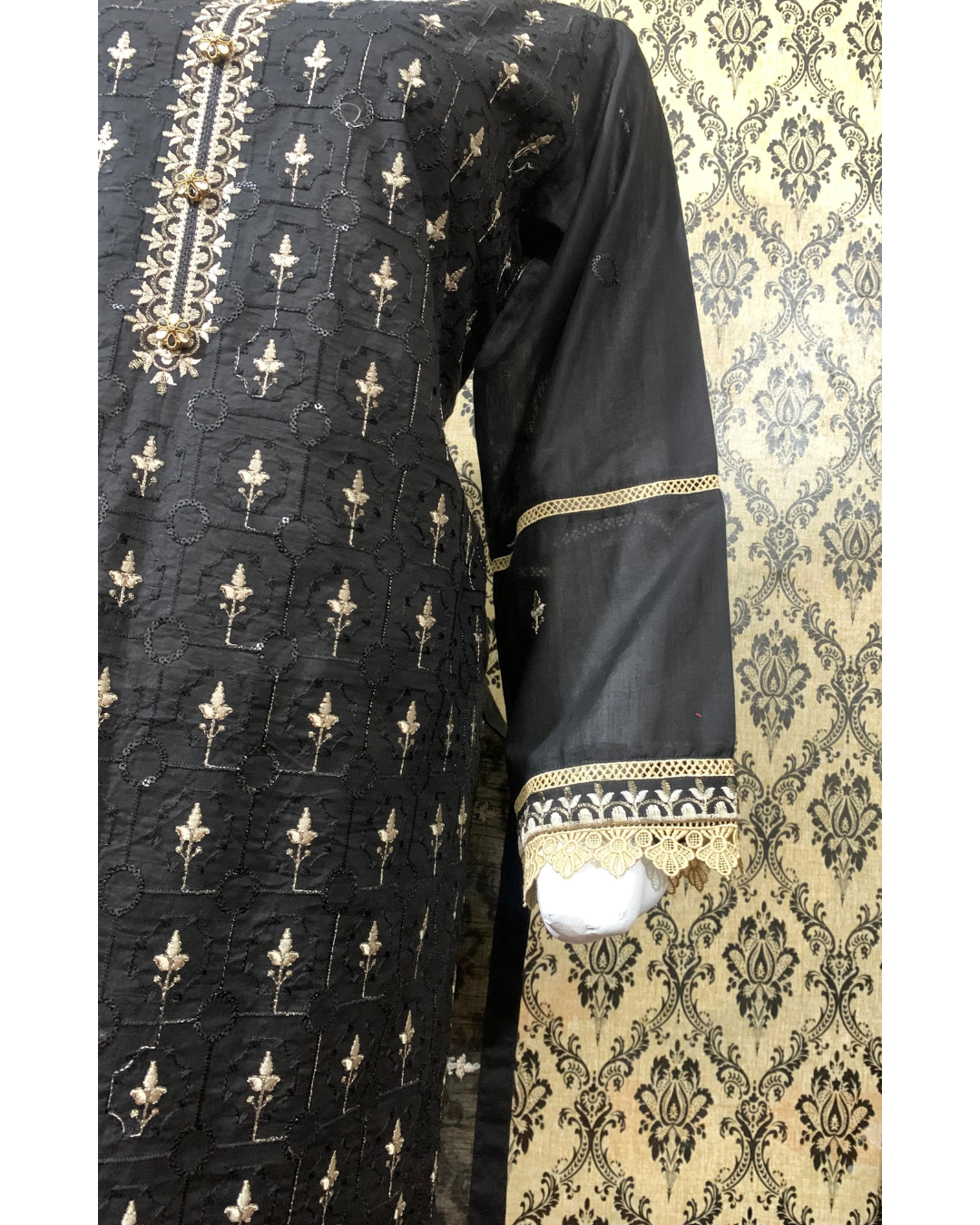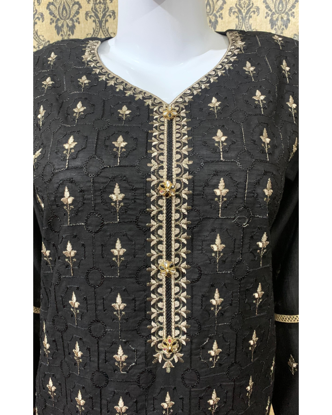This Black Embroidered Lawn Suit is an embodiment of graceful sophistication, offering a harmonious blend of traditional artistry and modern wearability, ensuring you exude confidence and style.