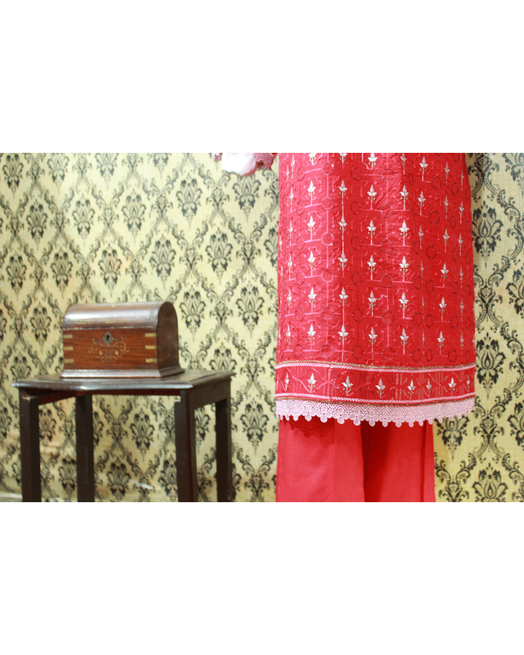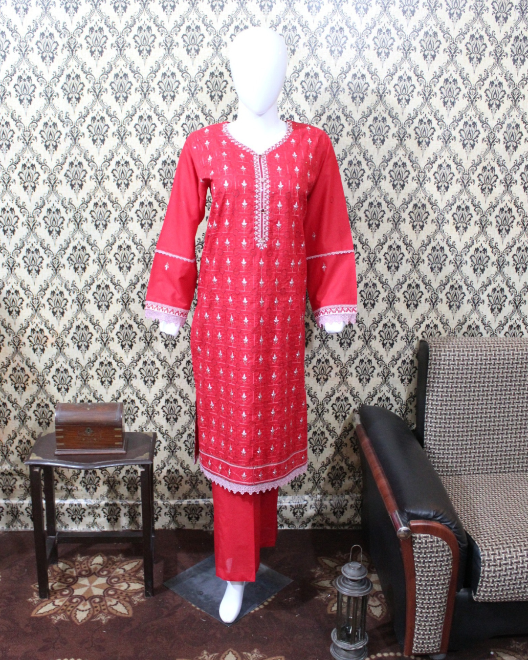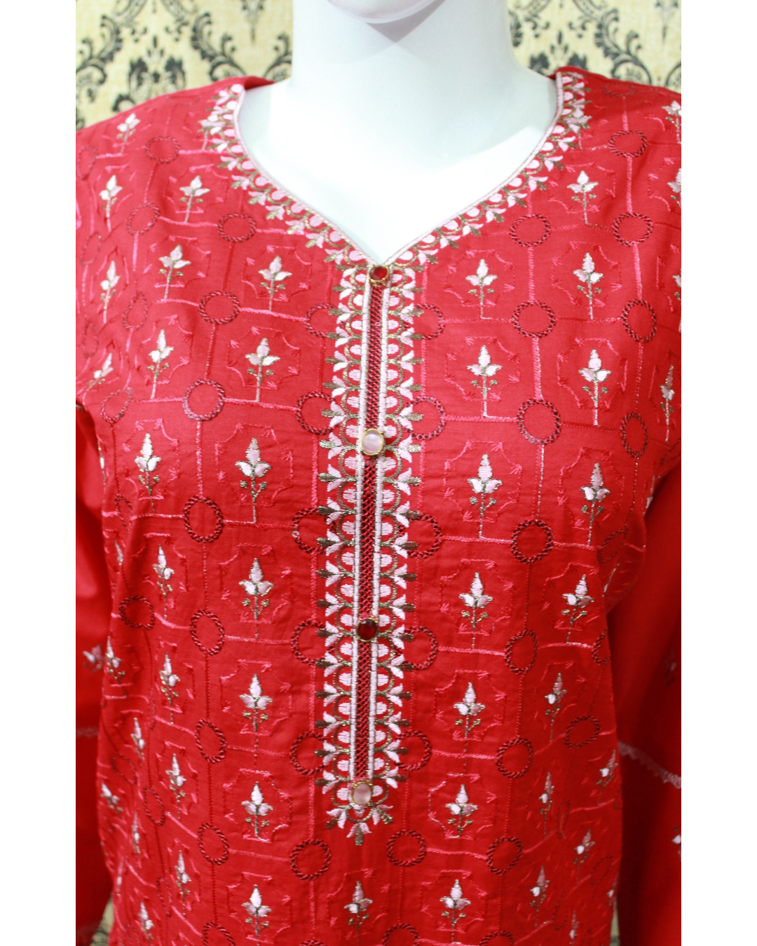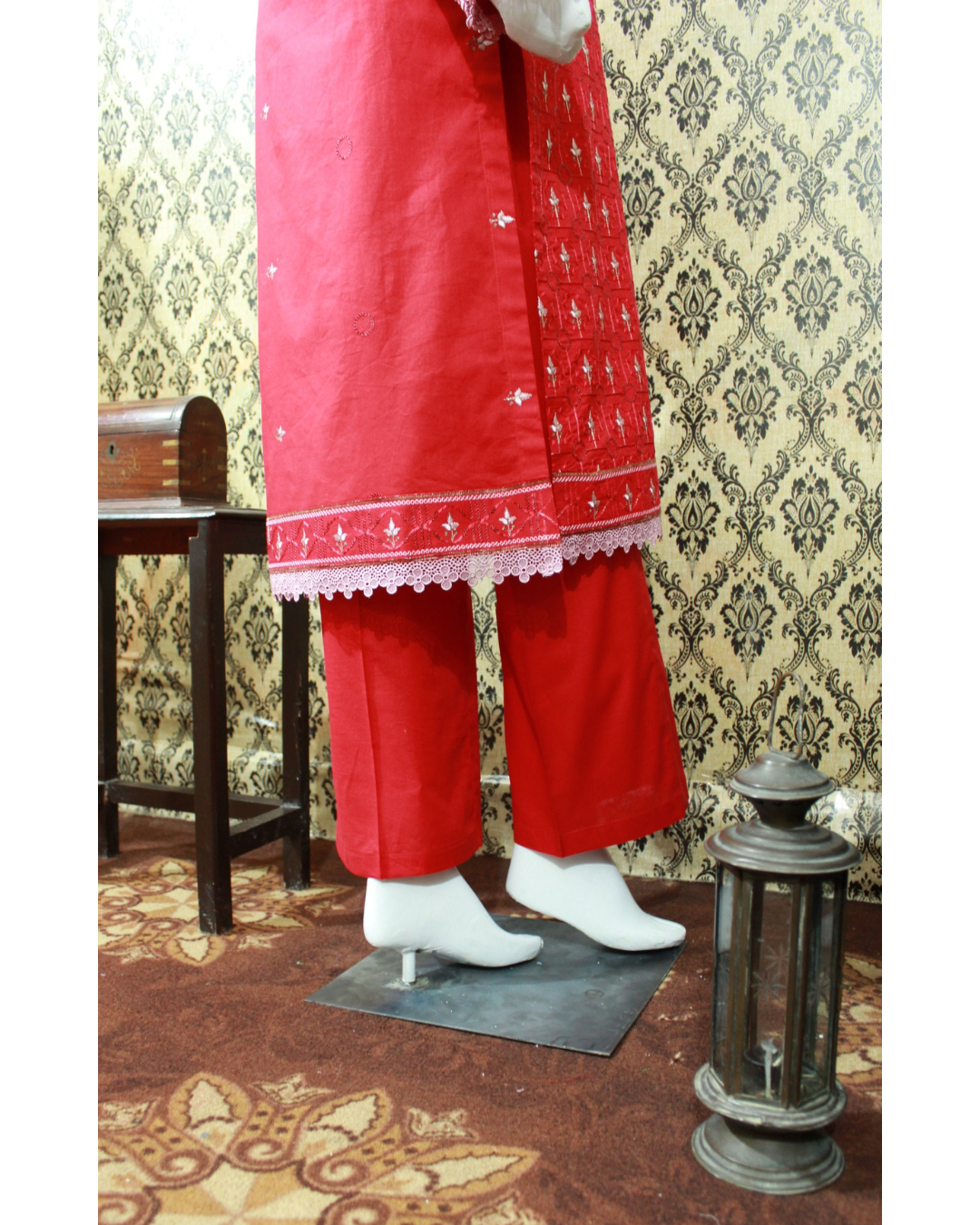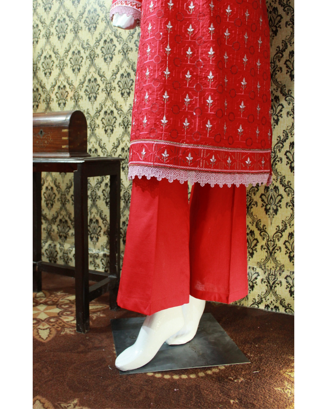 Bottom (Pant Trouser): Completing this elegant suit is a plain red lawn pant trouser. The comfortable straight-cut design ensures a flattering fit and ease of movement, making it a versatile and stylish choice for all-day wear.