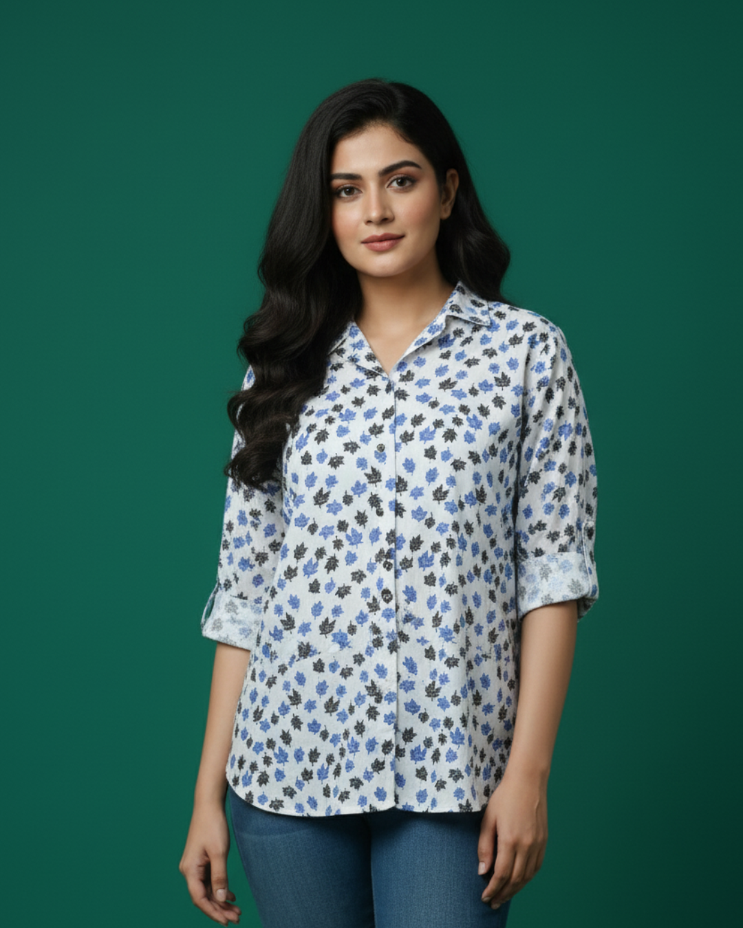 This shirt features a vibrant blue and black leaf print on a crisp white base, a classic collar, and stylish roll-up sleeves for a relaxed look. Pair it easily with your favorite jeans!